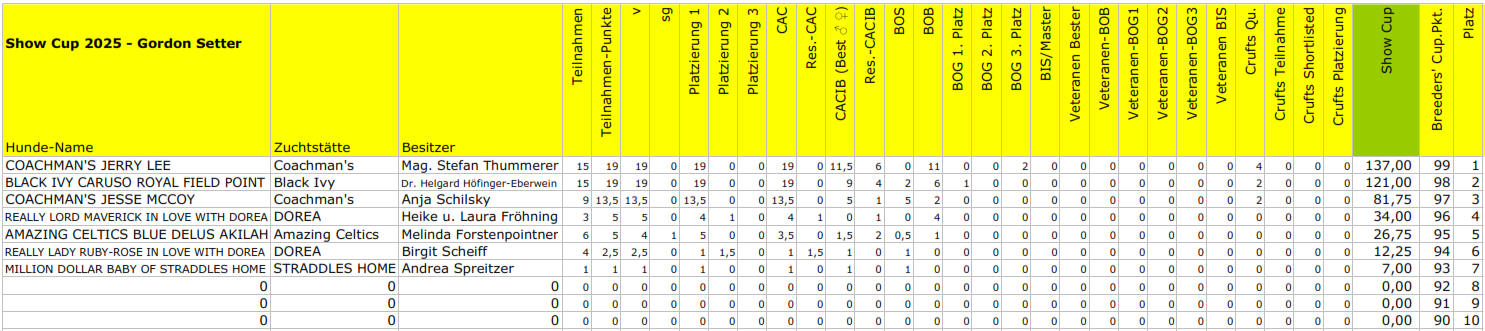 Beim Show-Cup des Österreichischen Setter Clubs werden alle dem Clubbüro gemeldeten und am Datenblatt des jeweiligen Setters auf "Unsere Setter" eingetragenen Ergebnisse von allen Ausstellungen im In- und Ausland herangezogen.